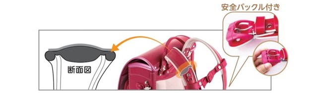 背負ったときに横幅が肩からはみ出してしまうと危険なので、背負い用にはむいていませんが、車いすやバギーに取付やすいタイプのランドセルです。