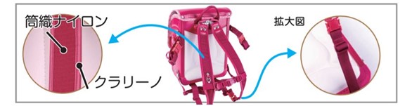 一般的なランドセルと同じで、本体と同じクラリーノの素材の肩ひもにクッション材が入っているのでやわらかく、肩ひもの付け根が立ち上がって立体的なアーチが施されているので、肩にやさしくぴったりフィットします。ベルトの長さの調節はベルト穴で行うことができます。