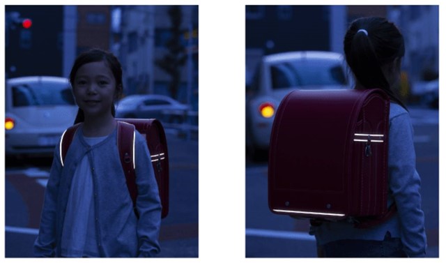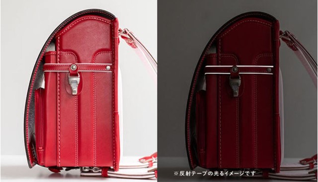 「光るランドセル」では、ランドセルの側面の反射材が、車のライト、太陽光や蛍光灯の光にあたると夜はキラキラ浮かび上がり、昼もは光の角度にいよってグラデーションに光ります。